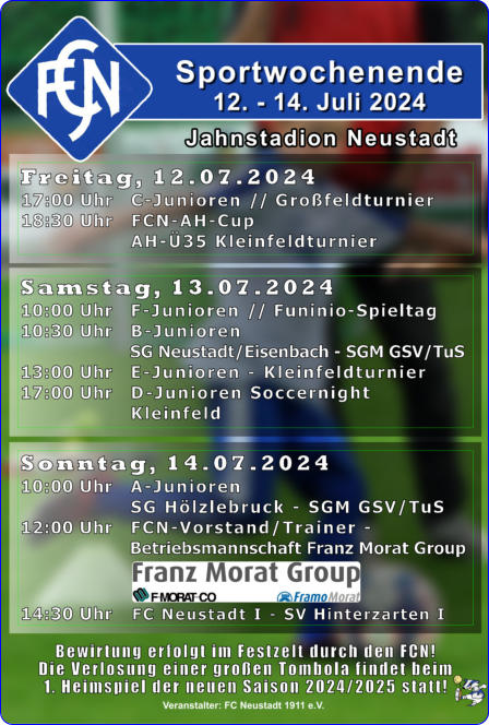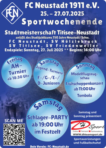PROGRAMMFreitag, 25. Juli 202517:30 Uhr- B-Jugend SG Neustadt-Eisenbach - SGM GSV Pleidelsheim/TuS Freiberg18:30 Uhr- AH Ü-35 Kleinfeldturnier (FCN-AH-Cup)Samstag, 26. Juli 202510:00 Uhr- F-/G-Junioren - Funino - Spieltag13:00 Uhr- E-Junioren Kleinfeldturnier (6+1)15:00 Uhr- D-Junioren Kleinfeldturnier (6+1)17:00 Uhr- A-Junioren SG Neustadt-Hölzlebruck - SG Freiburg-Nordab 19:00 Uhr- Schlagerparty im Festzelt mit DJ Harry Eintritt frei * mit Malle-Schlager-Outfit ein FreigetränkSonntag, 27. Juli 202511:00 Uhr- C-Junioren SG Neustadt-Eisenbach - SG Oberes Bregtal11:00 Uhr- Frühschoppenkonzert mit dem Duo „Bei Hämpels unterm Sofa“- Modellflugshow im Stadion mit MBV Vöhrenbachab 14:00 Uhr- Endspiele um die Stadtmeisterschaft 2025 Im Rahmen des Stadtjubiläums 750 Jahre Neustadt/Schw.14:00 Uhr- Spiel 3. Platz:SG Friedenweiler/Rötenbach - SV Titisee16:00 Uhr- Endspiel:FC Neustadt - SV Hölzlebruck