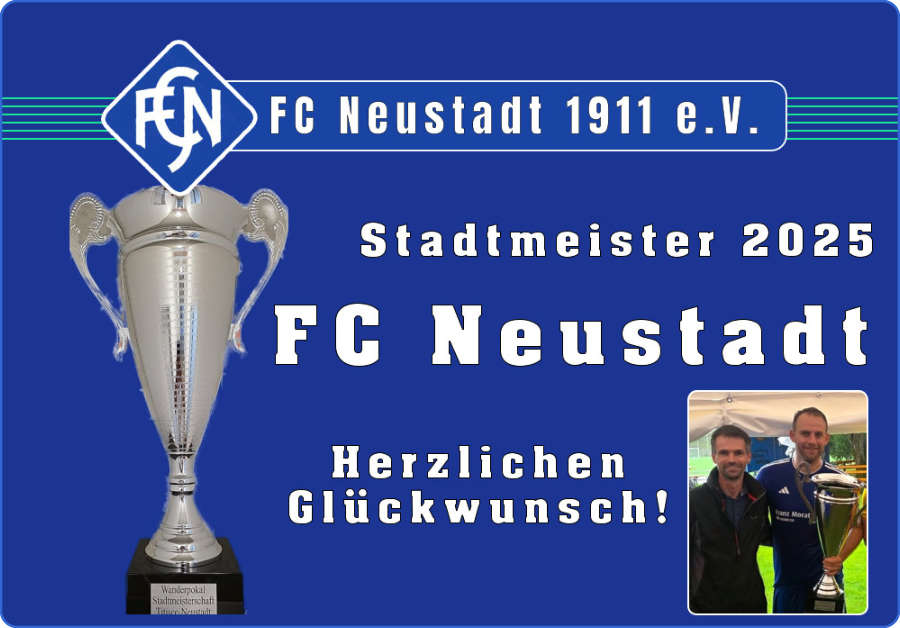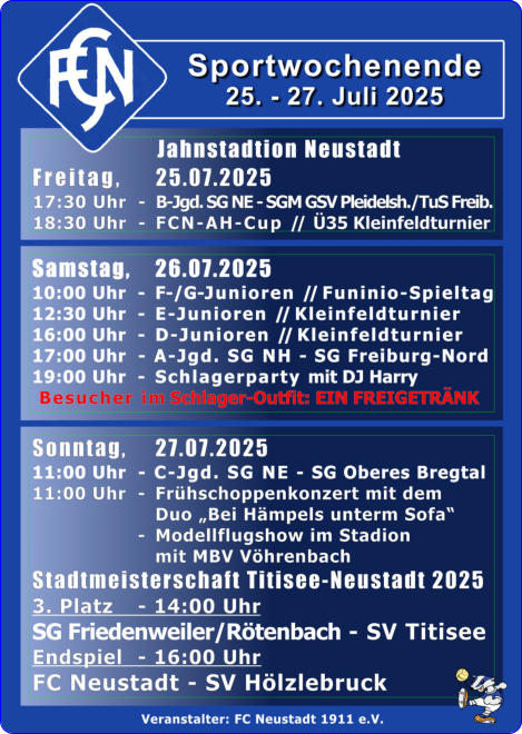 PROGRAMMFreitag, 25. Juli 202517:30 Uhr- B-Jugend SG Neustadt-Eisenbach - SGM GSV Pleidelsheim/TuS Freiberg18:30 Uhr- AH Ü-35 Kleinfeldturnier (FCN-AH-Cup)Samstag, 26. Juli 202510:00 Uhr- F-/G-Junioren - Funino - Spieltag13:00 Uhr- E-Junioren Kleinfeldturnier (6+1)15:00 Uhr- D-Junioren Kleinfeldturnier (6+1)17:00 Uhr- A-Junioren SG Neustadt-Hölzlebruck - SG Freiburg-Nordab 19:00 Uhr- Schlagerparty im Festzelt mit DJ Harry Eintritt frei * mit Malle-Schlager-Outfit ein FreigetränkSonntag, 27. Juli 202511:00 Uhr- C-Junioren SG Neustadt-Eisenbach - SG Oberes Bregtal11:00 Uhr- Frühschoppenkonzert mit dem Duo „Bei Hämpels unterm Sofa“- Modellflugshow im Stadion mit MBV Vöhrenbachab 14:00 Uhr- Endspiele um die Stadtmeisterschaft 2025 Im Rahmen des Stadtjubiläums 750 Jahre Neustadt/Schw.14:00 Uhr- Spiel 3. Platz:SG Friedenweiler/Rötenbach - SV Titisee16:00 Uhr- Endspiel:FC Neustadt - SV Hölzlebruck